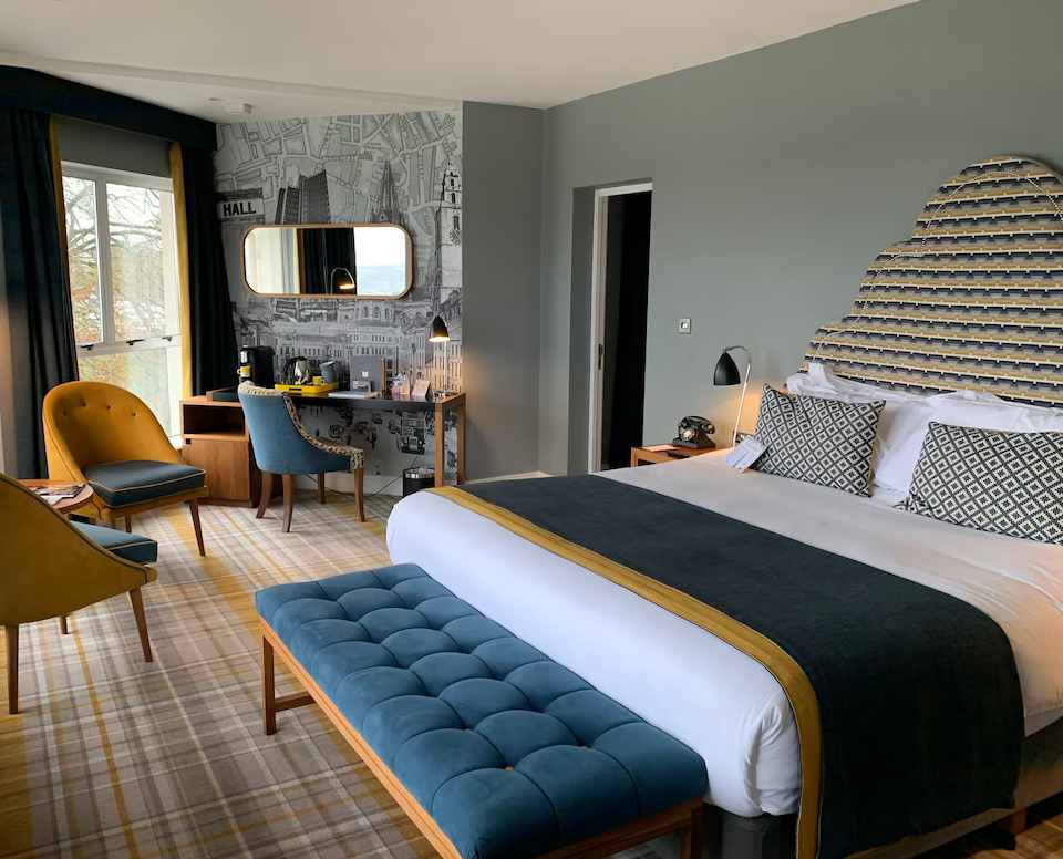 The room features a plush king-size bed with crisp linens and soft pillows to ensure a good night's sleep.